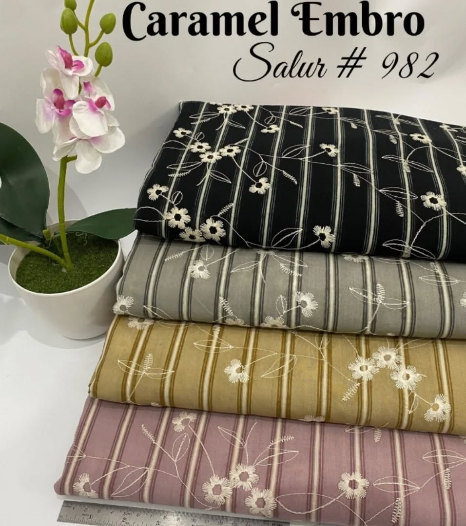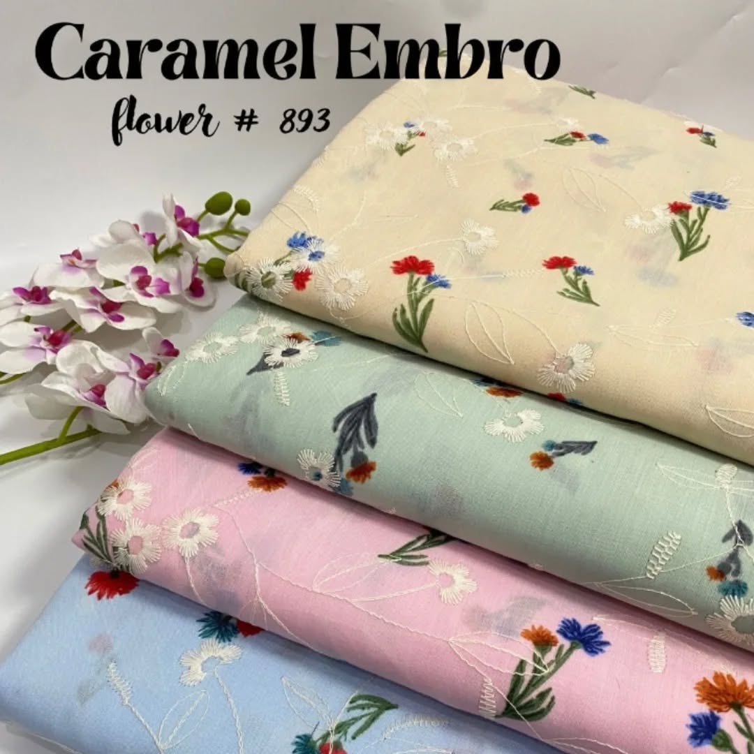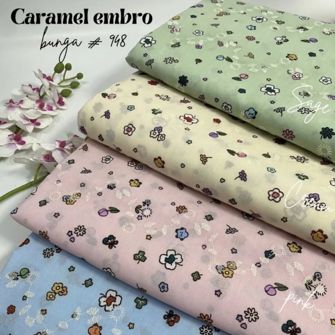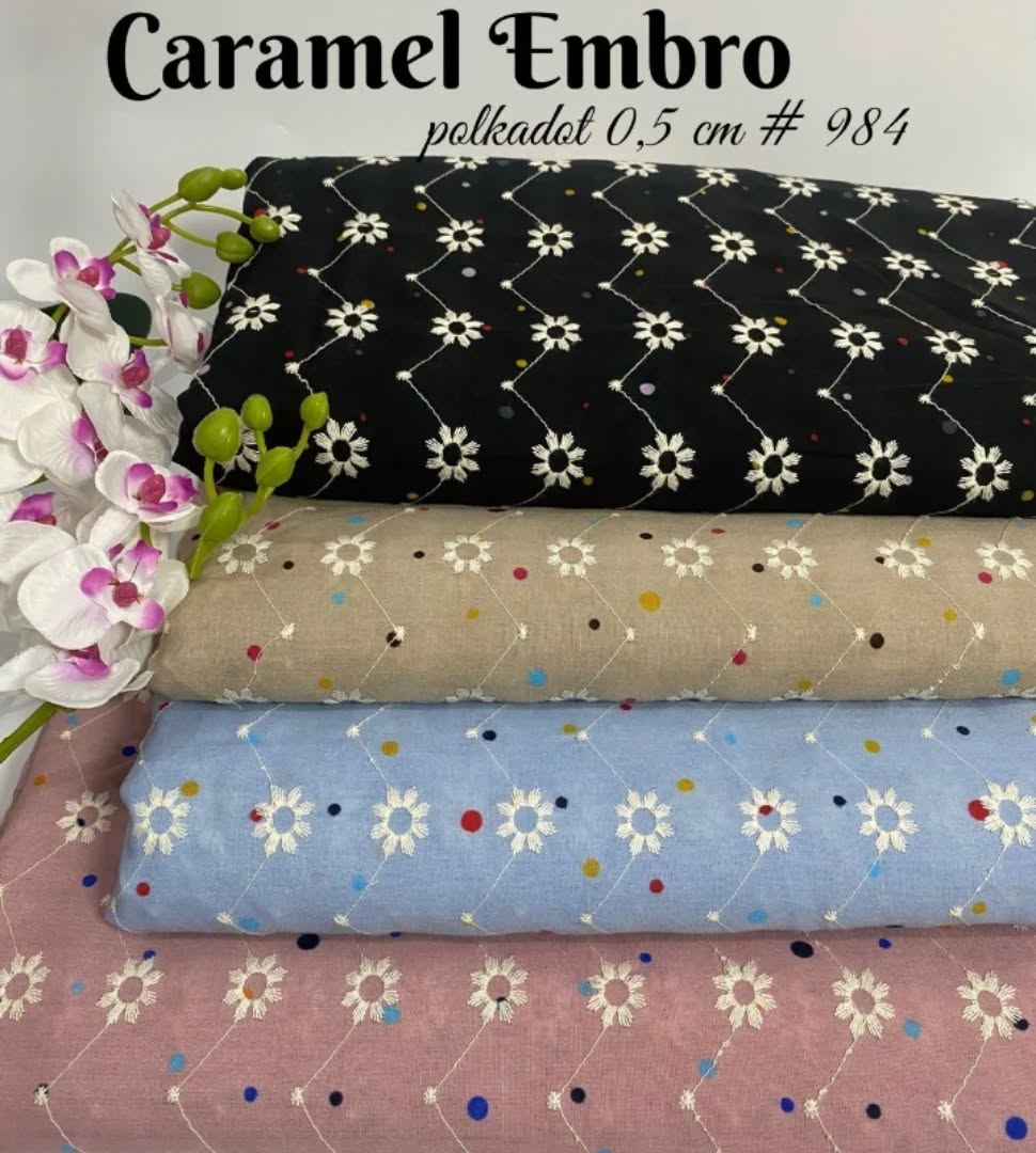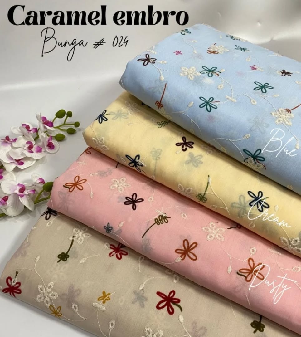 Bahan Caramel Embro – Polly Cotton dengan Motif Bunga Embroidery, Lebar 150 cm, 4 Pilihan Warna Menarik