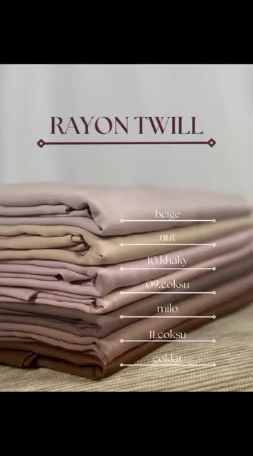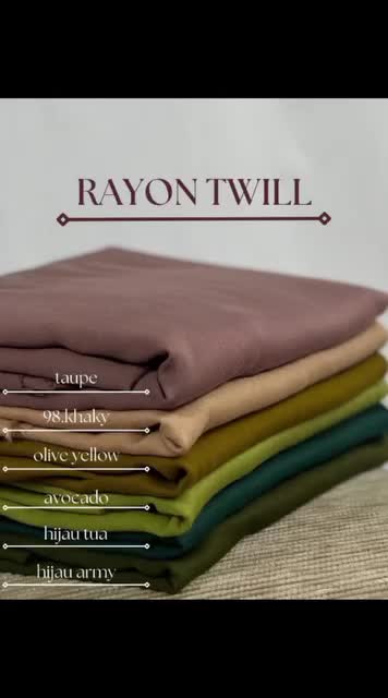 Rayon twill adalah jenis kain berbahan dasar rayon yang ditenun menggunakan teknik twill. Teknik ini menghasilkan pola diagonal yang khas pada permukaan kain. Kombinasi serat rayon dengan pola tenun twill membuatnya lebih kuat dibanding rayon biasa, namun tetap lembut dan nyaman di kulit.